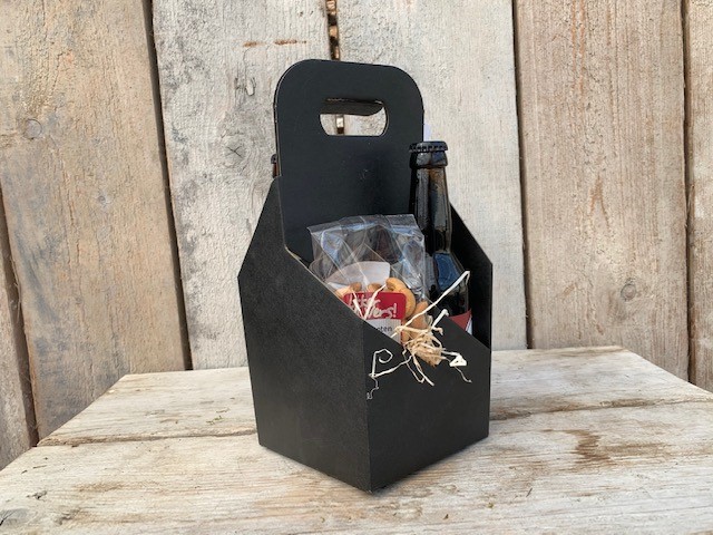 Een zwart bierrekje met handvat, makkelijk mee te nemen.