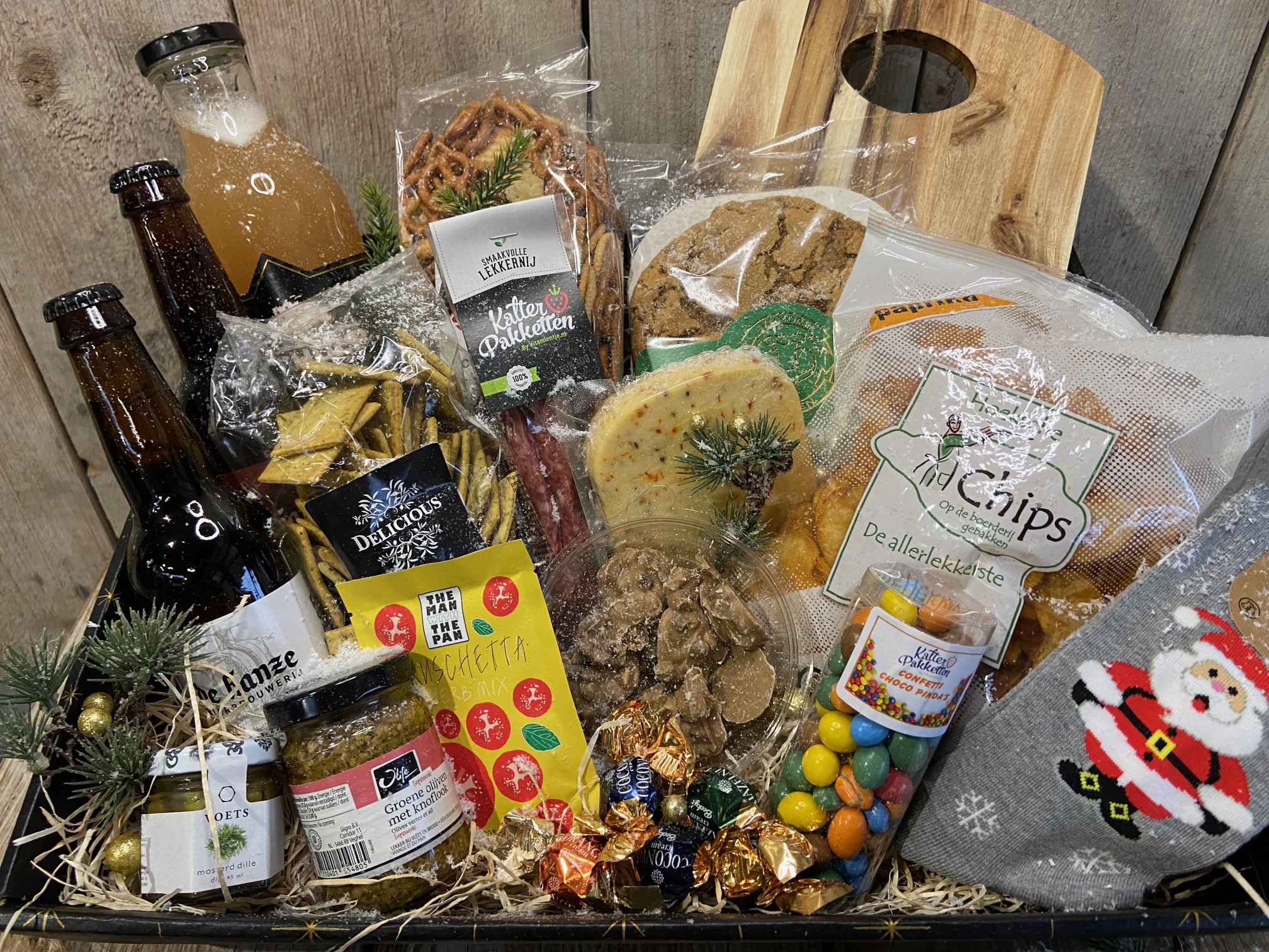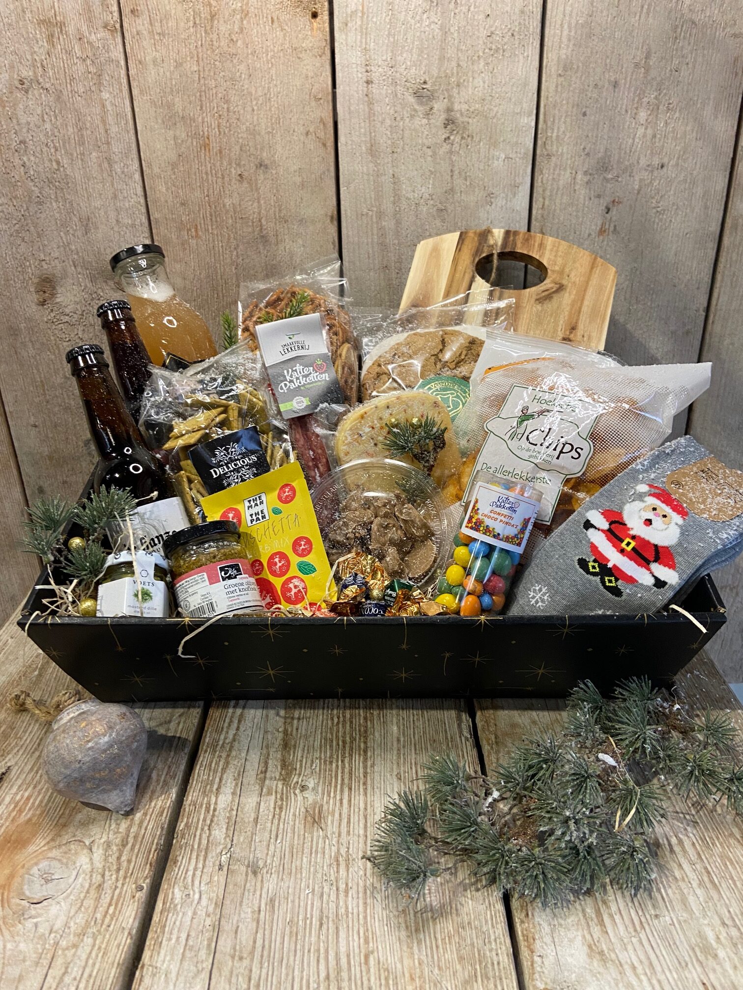Een mooie grote, feestelijke pakketbak gevuld met o.a.: