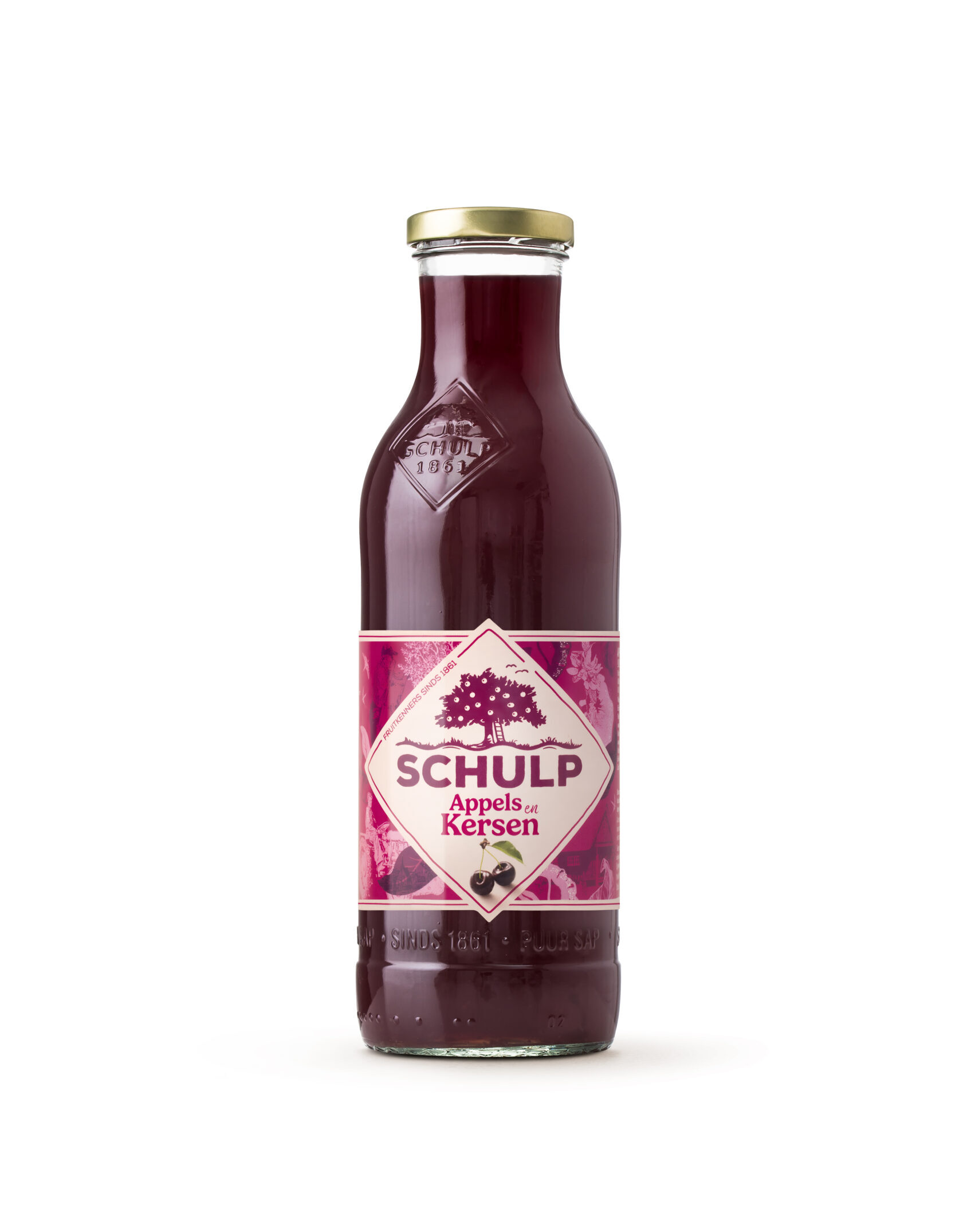 Smaakvol appel-kersensap uit de ambachtelijke perserij van Schulp. Een gezonde en verantwoorde keuze. 80% Hollandse appels en 20% kersen.